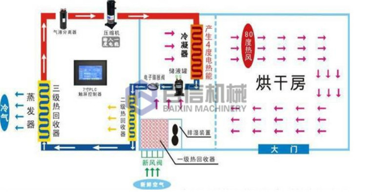 1、主機(加熱系統):利用輸入很少的電能吸收空氣中的免費熱量,用來烘干物料。